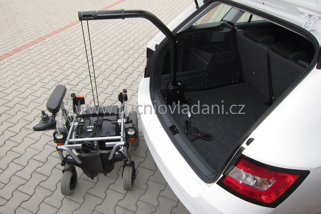 Під час завантаження ви просто закріплюєте гак за заздалегідь підготовлену розпірку на візку та за допомогою електричного пульта керування задаєте підйом. Після подолання висоти порога стрілу з візком повертаєте в багажне відділення й опускаєте візок на підлогу автомобіля. Поворот стріли зазвичай оснащуємо електричним керуванням для ще зручнішої маніпуляції. Під час руху кран не стукає й не створює шуму. Ми виготовляємо крани з вантажопідйомністю до 60 кг для механічних візків і до 180 кг — для електричних.